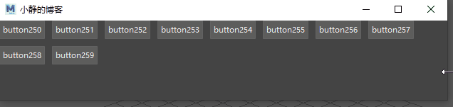import maya.cmds as cmds cmds.window(title='小静的博客',w=300,h=100) cmds.flowLayout( columnSpacing=10, wrap=1) for i in range(10): cmds.button() cmds.showWindow() - 参考
