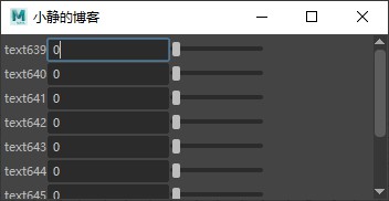 import maya.cmds as cmds cmds.window(title='小静的博客', widthHeight=(350, 150) ) scrollLayout = cmds.scrollLayout( horizontalScrollBarThickness=16, verticalScrollBarThickness=16) cmds.rowColumnLayout( numberOfColumns=3 ) for index in range(10): cmds.text() cmds.intField() cmds.intSlider() cmds.showWindow() value = cmds.scrollLayout(scrollLayout, query=True, scrollAreaValue=True) top = value[0] left = value[1] -