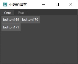 import maya.cmds as cmds cmds.window(title='小静的博客', widthHeight=(200, 150) ) form = cmds.formLayout() tabs = cmds.tabLayout(innerMarginWidth=5, innerMarginHeight=5) cmds.formLayout( form, edit=True, attachForm=((tabs, 'top', 0), (tabs, 'left', 0), (tabs, 'bottom', 0), (tabs, 'right', 0)) ) child1 = cmds.rowColumnLayout(numberOfColumns=2) cmds.button() cmds.button() cmds.button() cmds.setParent( '..' ) child2 = cmds.rowColumnLayout(numberOfColumns=2) cmds.button() cmds.button() cmds.button() cmds.setParent( '..' ) cmds.tabLayout( tabs, edit=True, tabLabel=((child1, 'One'), (child2, 'Two')) ) cmds.showWindow() -